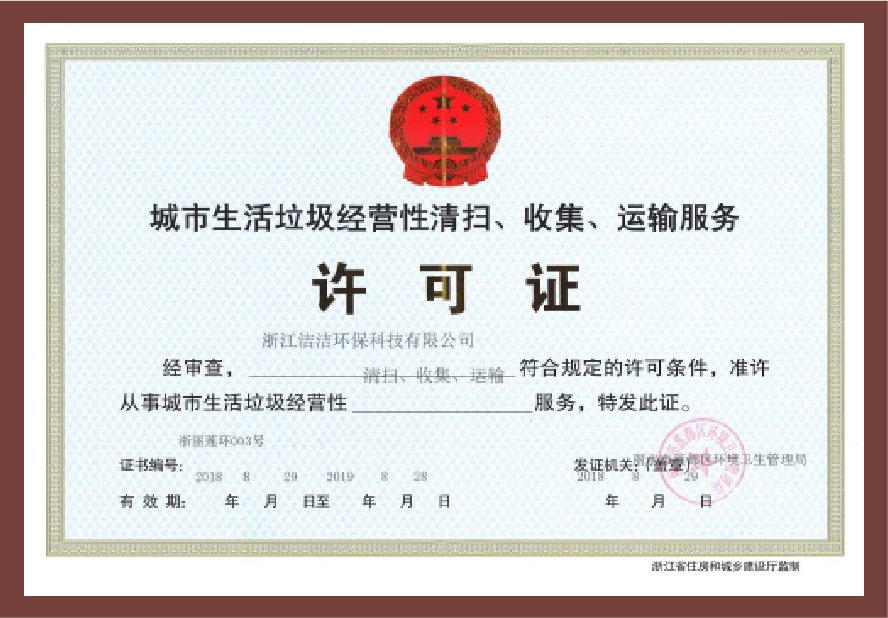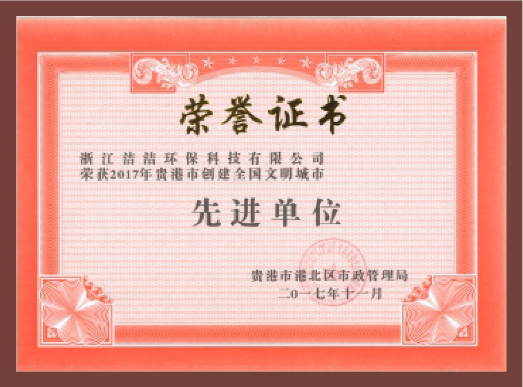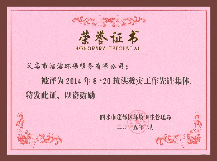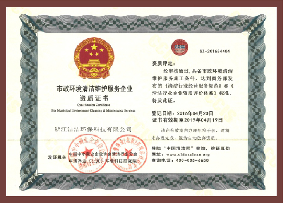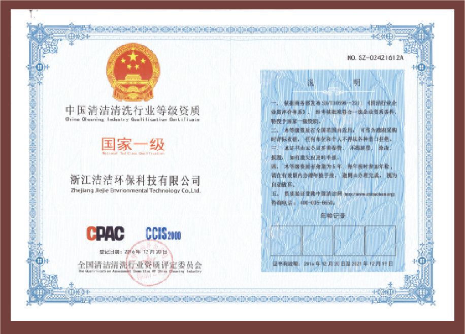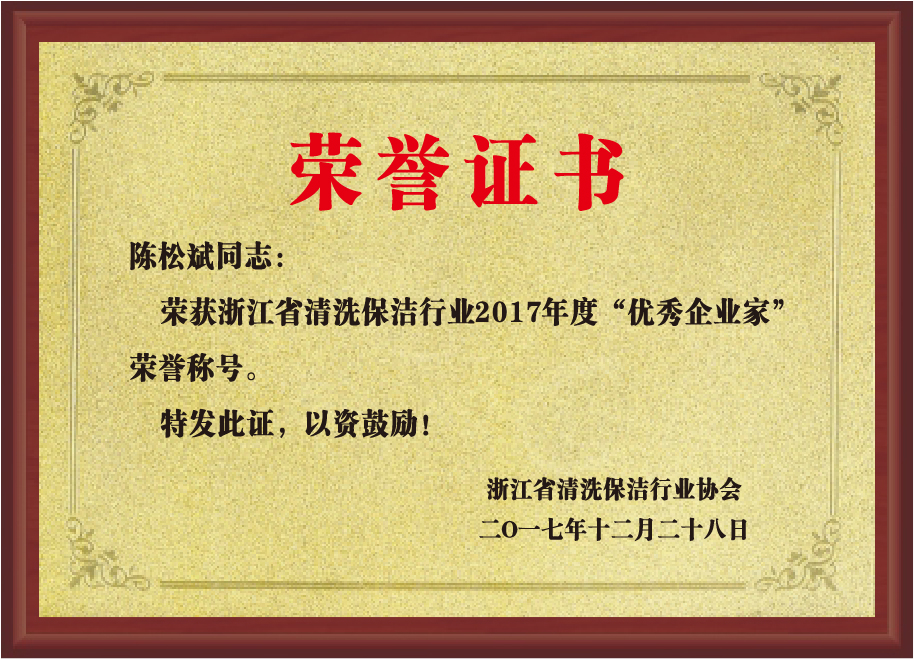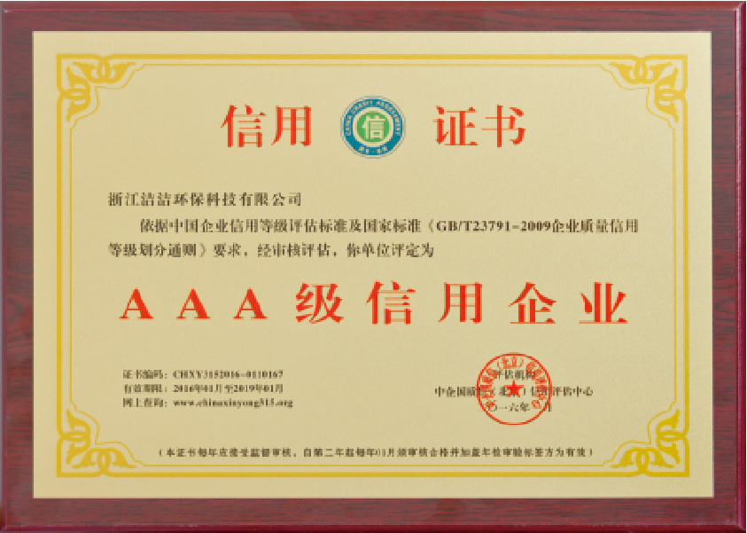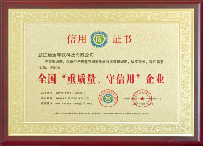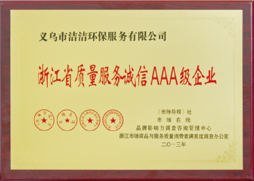 重要榮譽:“全國信用等級AAA級企業(yè)”、全國“重質量、守信 用企業(yè)”、“浙江省質量服務誠信AAA級企業(yè)”、中國中小商業(yè) 企業(yè)協會清潔行業(yè)分會常務理事員會單位